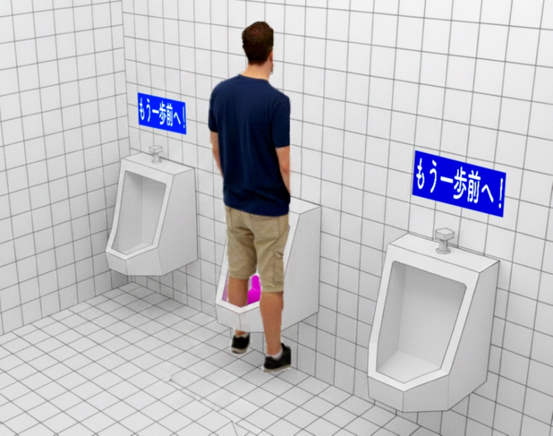 消防によると、店内の小便器には、床を汚さないよう「もう一歩前へ」という注意書きが貼られていた。男性は指示通り一歩前へ出て、便器や壁の中に体の一部が入り込んだとみられる。
